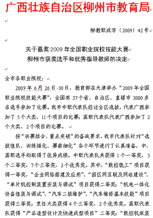 2010年1月14日,柳州市教育局下发了《关于嘉奖2009年全国职业院校技能大赛柳州市获奖选手和优秀指导教师的决定》(柳教职成字〔2009〕42号),我院机电工程系关来德等4位老师、潘红光等6位学生受到了嘉奖。
